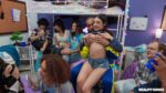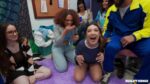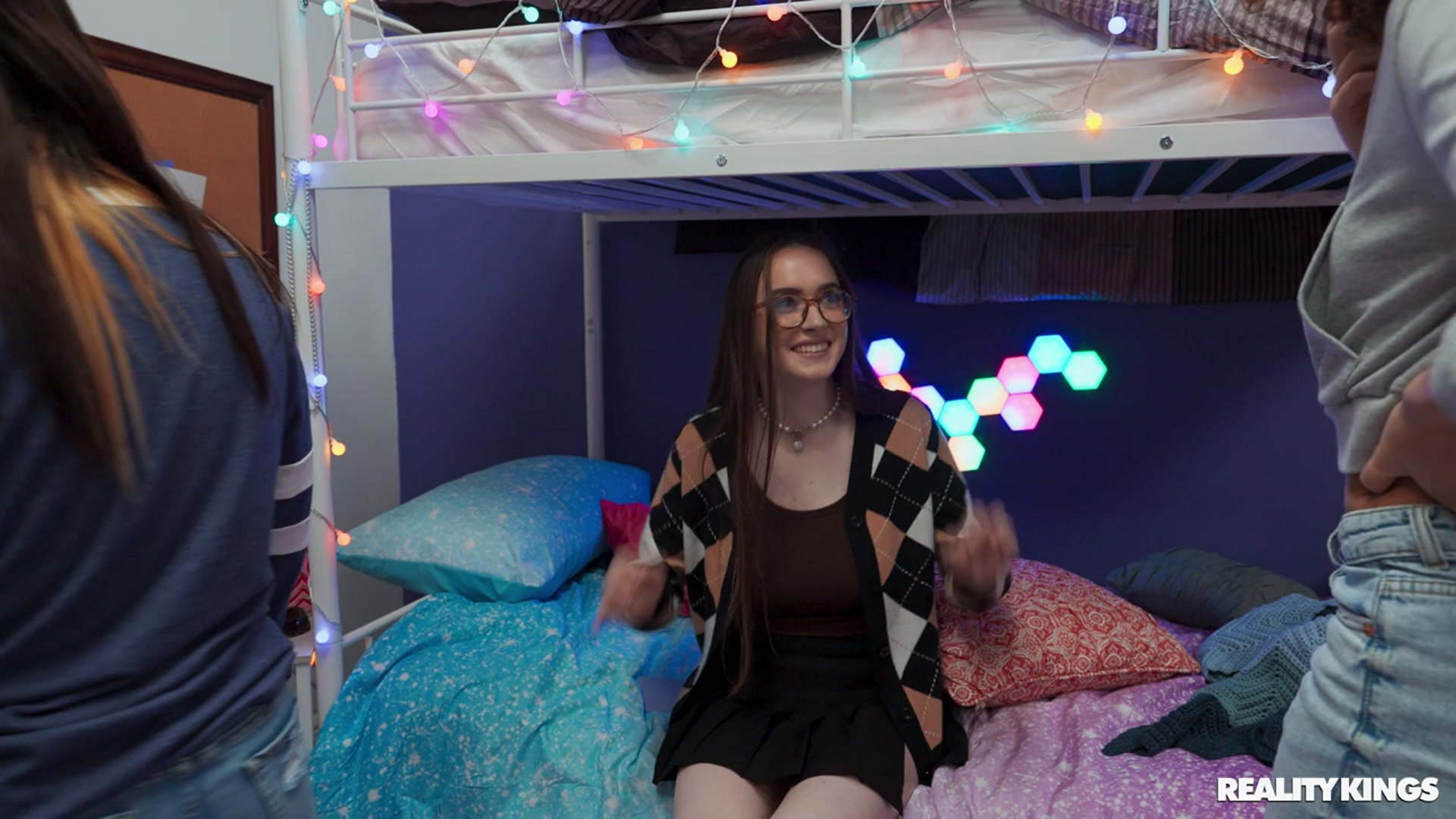 The dorm room orgy begins with Violet Gems waving playfully before the clothes come off. Hazel Moore, Willow Ryder and Violet Gems strip dow…